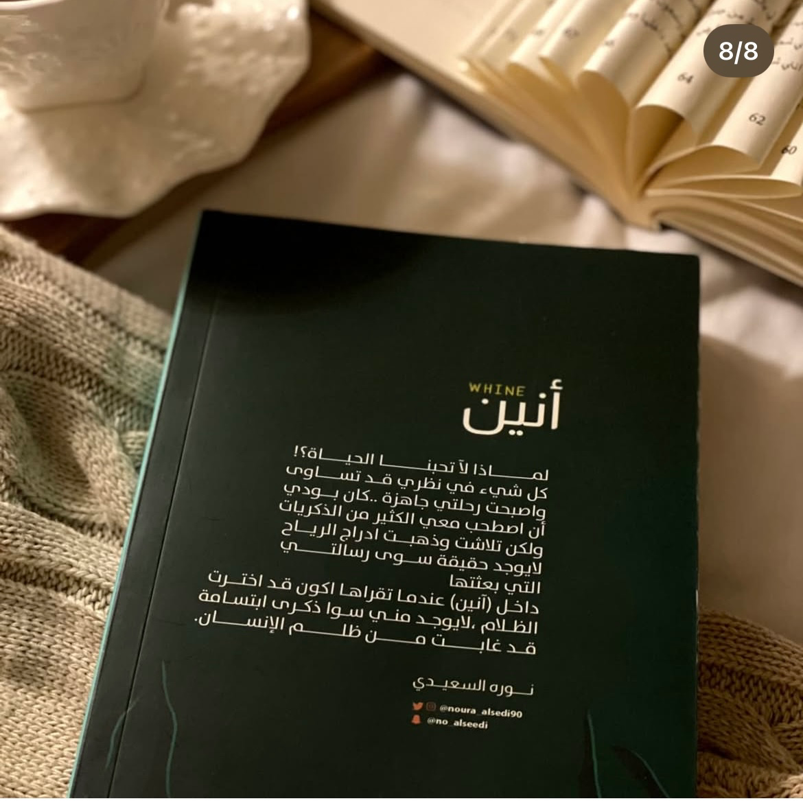 رواية أنين للكاتبة نورة السعيدي تُعدّ عملًا أدبيًا عميقًا يسلّط الضوء على الألم والبحث عن معنى الحياة والذاكرة، حيث يغوص القارئ في رحلة نفسية مع بطل الرواية الذي يصل إلى حالة من اليأس، فتتلاشى ذكرياته ويبقى أثر رسالة أخيرة تكشف دوافعه وأفكاره. تعتبر الرواية صرخة إنسانية مؤثرة تدفع القارئ للتفكير في الوجود والبحث عن الضوء داخل الظلام.